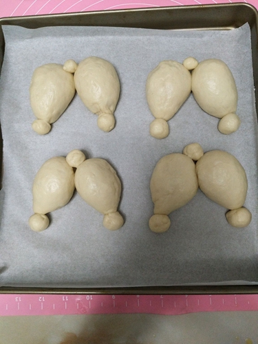 做法分解5:发酵好后,面团揉搓排气,分成4个面剂。取一个面剂揪出3个小面团做尾巴和爪子,余下的对半分,揉出2个半边柯基屁屁造型。其他3个面团以此类推做完。