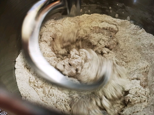 做法分解1:中筋粉(平时普便用来做馒头的面粉)、新良黑全麦自发粉倒入厨师机的搅拌缸内。ps:完全可以整一个大面盆手揉,我偷懒了。