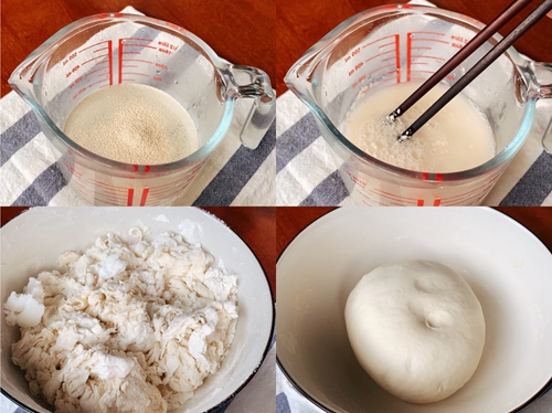 做法分解1:40度温水里加入白糖,酵母,搅拌均匀静置5分钟,倒入面粉里搅拌成面絮,再揉成光滑的面团