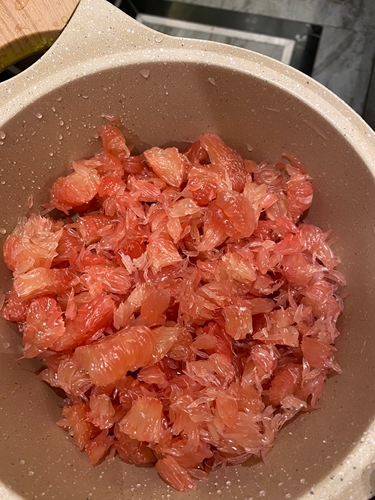 做法分解3:用的红色柚子,随意的。有啥用啥。剥成这样就可以了,不要留白色的筋会苦