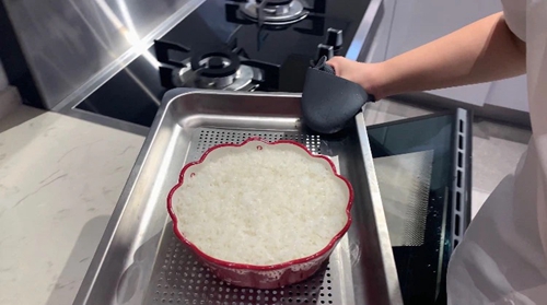 做法分解1:用火星人集成灶,将米洗净放入蒸箱,设定时间20分钟,模式选择:快速蒸。