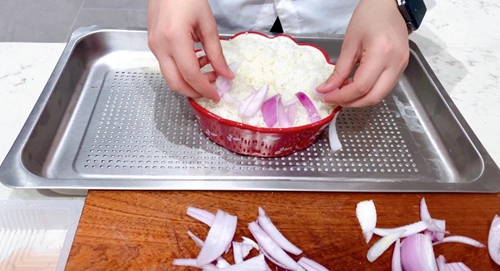 做法分解8:用全新Q3C蒸烤一体集成灶,设定热风烧烤模式,芝士融化即可出炉。