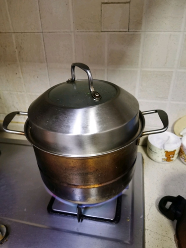 做法分解4:水开后把姜片放底层,大闸蟹倒放姜片上面防止蟹黄流出,紫苏叶放大闸蟹上面,闹钟定时大火蒸10分钟。