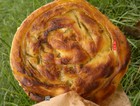 做法分解4:接下来,手沾油取出一块面团,擀成片,抹上油酥,然后卷起来,再擀成一个包子皮样,包进肉馅,然后连拉带扯的弄成这种薄的长的饼,撒上孜然和芝麻