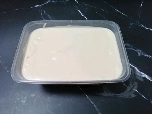 做法分解8:将打发的淡奶油分三次加入到芝士液中翻拌均匀,提拉米苏液完成