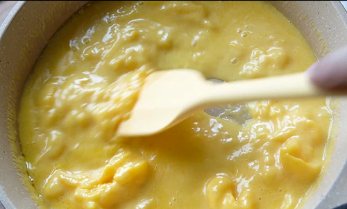 做法分解2:加入3个鸡蛋、融化黄油(无盐)50克、糖60克,搅拌均匀,倒入炒锅里。开小火,用刮刀搅拌