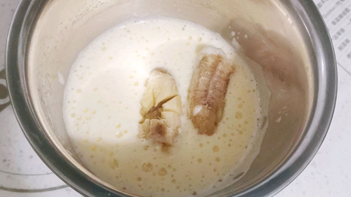 做法分解1:鸡蛋打入盆中,用电动打蛋器打发至发白浓稠加入香蕉,继续搅打均匀