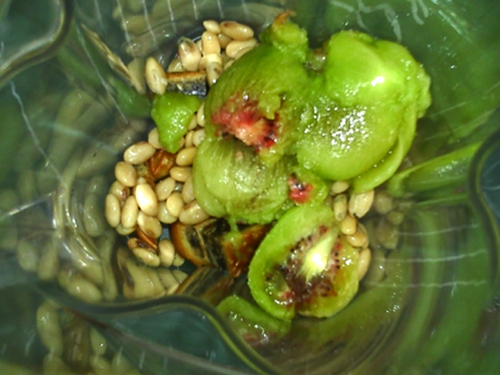 豆浆还真是解决一切的好东西。嫌单纯的月饼豆浆太过甜香,索性就把同月饼一起泛滥成灾的猕猴桃扔两颗进去,在解决月饼的同时,也解决一点猕猴桃。希望猕猴桃的酸甜,可以冲淡月饼的甜腻。选中一个五仁月饼,希望能带给豆浆以坚果的力量。然而,时下的五仁月饼似乎都以蓉沙为黏合剂,果仁占比看着并不高。还是自己的五仁更货真价实。揭盖,猕猴桃的气息扑面而来。随着糊浆的流动,月饼的甜香四下里散开,并压倒一切。老实说,越来越不喜欢这个味道,好像所有市售月饼如出一辙,都是这个味道。。。。