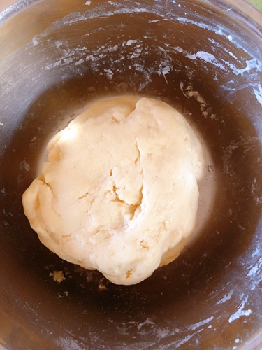 做法分解4:黄油和粉类混合均匀之后,加入淡奶油和蛋液。