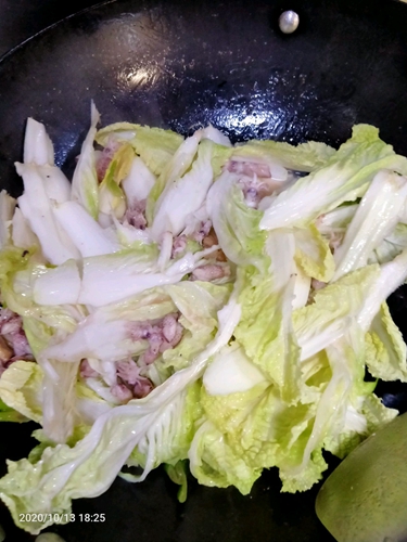 做法分解6:加入白菜继续炒软,可以加少量生抽