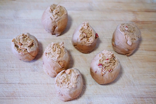 做法分解7:揪成小剂子,是双手反向拧,将剂子口朝上放置。