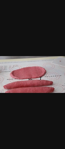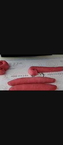做法分解18:揉成长条大概50厘米左右(此图为火龙果粉的面团)