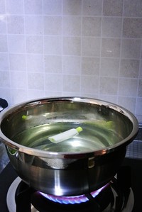 汆烫芹菜的水里加一根葱段,煮开一会,用葱水汆烫羊肚,这样可以清洗羊肚的腥气和去油腻