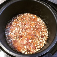 米淘完后,放入比平时煮饭稍少一点儿的水量,然后把所有食材倒入电饭锅内