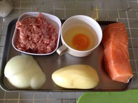 在碗中混合鲑鱼肉和免治猪肉,加入炒好的洋葱,土豆泥和蛋液,用盐和胡椒碎调味后制成小圆饼