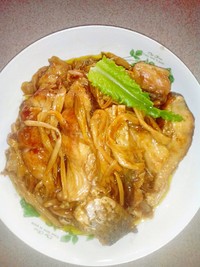 (生粉水:就是两盐勺生粉加蒸鱼豉油和成的水,如果感觉颜色太淡可以加几滴老抽下去)
