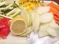 b.第二天将大蒜压泥,姜切片,洋葱切丝,番茄去籽后切块,擦一整只柠檬的皮屑后将其压汁,胡萝卜、西葫芦和黄椒切条,百里香可切段