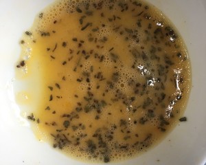 把鸡蛋打入蛋盆中,加入除芝士碎外的所有调料,搅拌均匀。