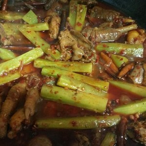 烧开后加入老干妈转中小火继续炖煮十分钟,随后放入青笋,根据自己对青笋口感进行小火炖煮,出锅前两分钟加入剩余30克花椒,大火烧开。