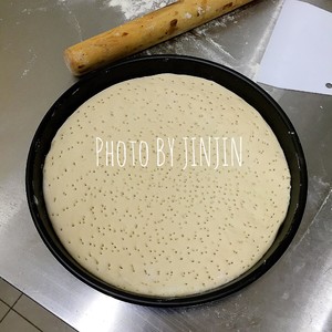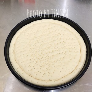 将披萨盘刷一层黄油(色拉油也可以),将打孔好的面饼放入披萨盘中,尽量使面饼贴合到披萨盘边。