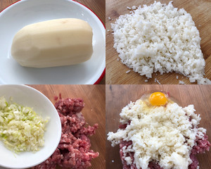 莲藕洗净、去皮后刨成丝,再剁碎。将其放入肉馅中,再依次加入葱花,鸡蛋,甘汁园玉米淀粉,和其他所有食材。