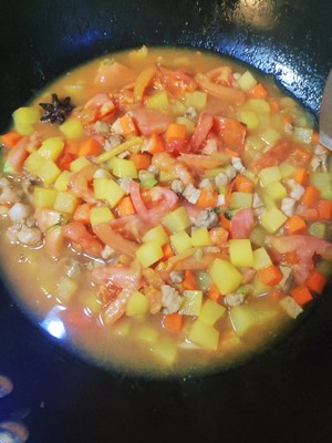 | 土豆,洋葱,西红柿,是最基本的三样,其他随意,还可以放豆角、芹菜木耳等,您随意吧! |