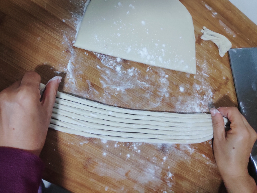 将面团擀成均匀的一厘米厚的面片,均匀的切成筷子粗细的条。