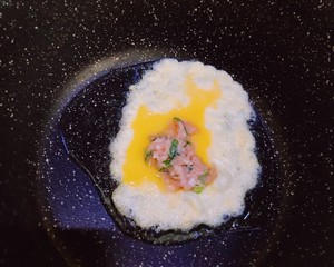 锅中加入油,开最小火,用汤勺子舀半勺蛋液,可将肉放在靠近蛋中间靠近一边的位置,以便于蛋能方便对折