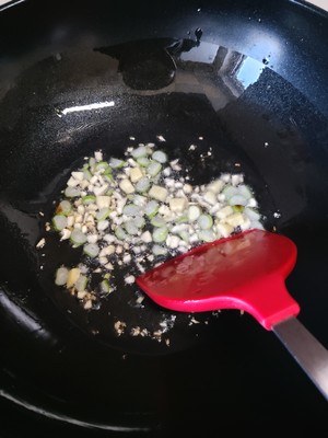 锅里放底油,烧至四成热,下葱姜蒜炒香
