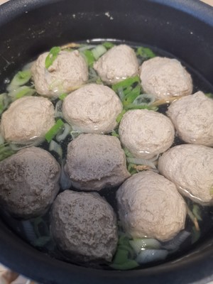等所有丸子浮起来加入部分葱和姜丝煮10分钟