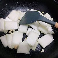 做法分解8:倒入冬瓜,继续翻炒变软出水。(冬瓜水份多,翻炒时会出汁)