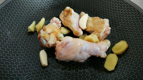 做法分解3:再开火热锅看情况补油,码上几块提前收拾好的带骨肥鸡肉