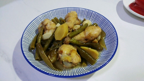鸡肉自选,酸豆角一把,泡椒三四个,泡姜一小块,蒜五瓣,盐一点,白糖一点,黄酒适量,油自选