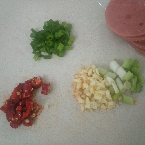 鸡蛋1个,啤酒排挡火腿1根,细面条适量,生抽1勺,醋1勺,耗油1勺,糖半勺,盐适量,直饮水适量,食用油适量,葱适量,蒜2瓣,小红椒2个