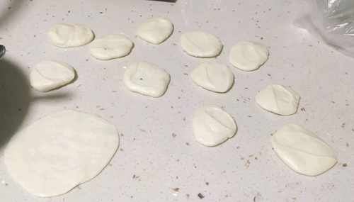 做法分解3:小面饼中加入馅儿,包好下面图点油,防止粘在台面上!锅中加入水,开火,水开把包好的蒸饺放入锅中蒸15-20分钟!