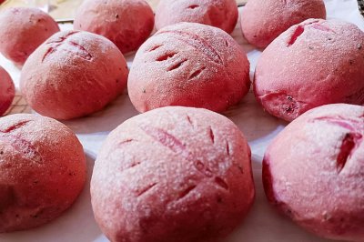红心火龙果170克,高筋面粉260克,耐高糖酵母3克,盐2克,水1000克,白砂糖50克