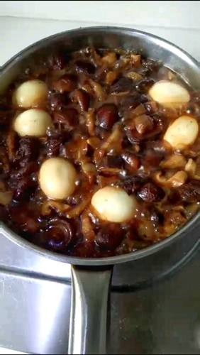 做法分解4:五花肉切丁放少许葱油炒出油(做红烧肉的前步),然后放入泡发好的香菇丁炒出香味加水炖煮20分钟后放入煮好的鸡蛋收卤。中间步骤没有拍图只好口述,也不知道说的清楚不清楚,如有不明白的地方问俺就可以了。