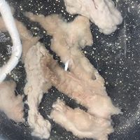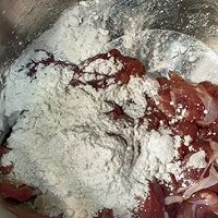 做法分解3:倒入适量红薯粉,把肉片均匀码粉,并撒少许盐