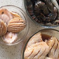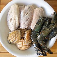 做法分解1:准备好新鲜食材,鲍鱼用刷子刷干净、大虾去掉脚及虾线、鸡中翅洗净备用。