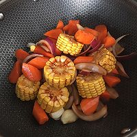 做法分解2:洋葱切丝、玉米切小段、胡萝卜滚刀切成块备用。