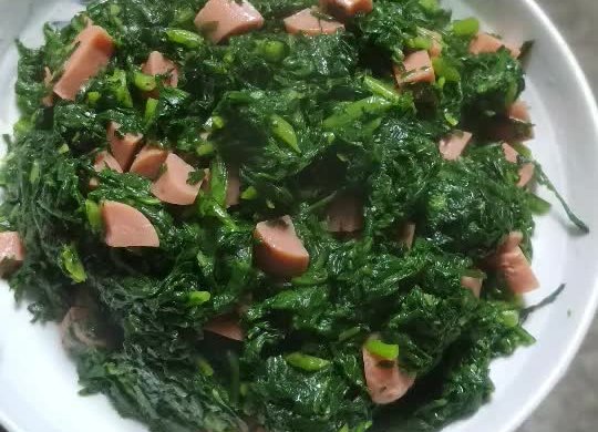 蒿菜200克,盐一勺,火腿肠2根,食用油3勺,麻油1勺