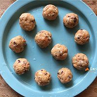 做法分解12:手沾少许温水,把馅料放在手心、握拳,从虎口处挤出小丸子