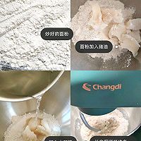 做法分解2:水油皮面团:中筋面粉,糖,猪油和水加入@长帝厨师机不锈钢碗中,首先选择低速搅拌,一分钟后4档中速揉和。10分钟就可以揉出图片中的手套膜了,特别方便而且节省时间哦。