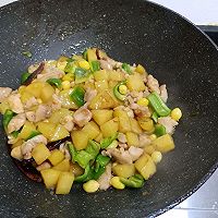 做法分解9:鸡肉变色后加入土豆,放少许盐,加一点水,炖10分钟。