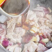 做法分解6:倒入腌制好的鸡腿肉,大火炒至变色;