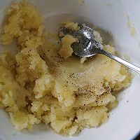 做法分解5:压好的土豆泥取一块压饼,包一点芝士,包起来压成饼