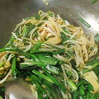 做法分解7:快出锅时放入韭菜翻炒几下,韭菜软了就出国,韭菜不能炒很久,基本到锅里翻炒几下就熟了,放不放盐根据自己口味
