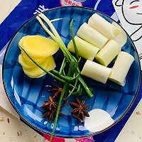 做法分解3:羊蝎子涝水时,可以准备生姜、葱白、八角和小葱备用。