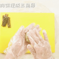 做法分解6:▲取部分肉泥捏成三角形饼状,然后贴上一片紫菜。