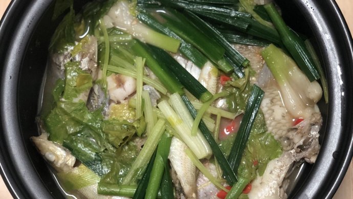 做法分解7:为了美观可以不用把小芹菜蒜苗焖一下,直接上锅也可以,不过我喜欢他们软绵绵的口感,超简单的一道家常菜起锅啦,建议用砂锅哦,保温效果杠杠的,吃完了锅还是暖暖的,毕竟凉了鱼就容易腥,动起来吧~